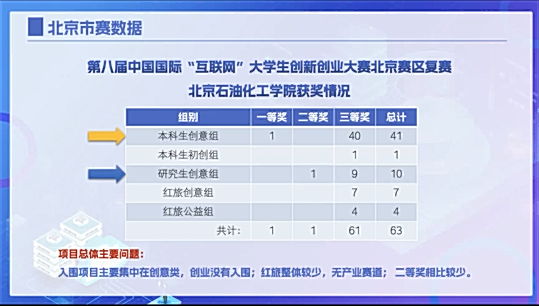 首先,從北京地區互聯網+大賽的年度數據,對我校參賽項目規模、實力等多方面做了對比分析,鼓勵學生有信心提升項目競爭力。