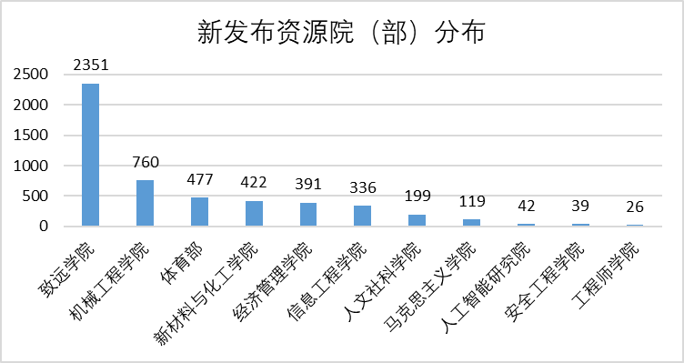 1.本月新發(fā)布資源5201個(gè),資源類型以文檔類(3085個(gè))為主,各院(部)的具體情況詳見(jiàn)下圖。