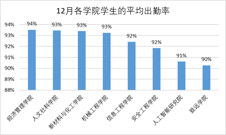 3.本月學(xué)生出勤率為93%,與上月學(xué)生出勤率持平。按所在學(xué)院學(xué)生出勤率排序,第一名經(jīng)濟(jì)管理學(xué)院(94%),第二名人文社科學(xué)院(93.46%),第三名新材料與化工學(xué)院(93.40%),各學(xué)院具體學(xué)生出勤情況詳見(jiàn)下圖。