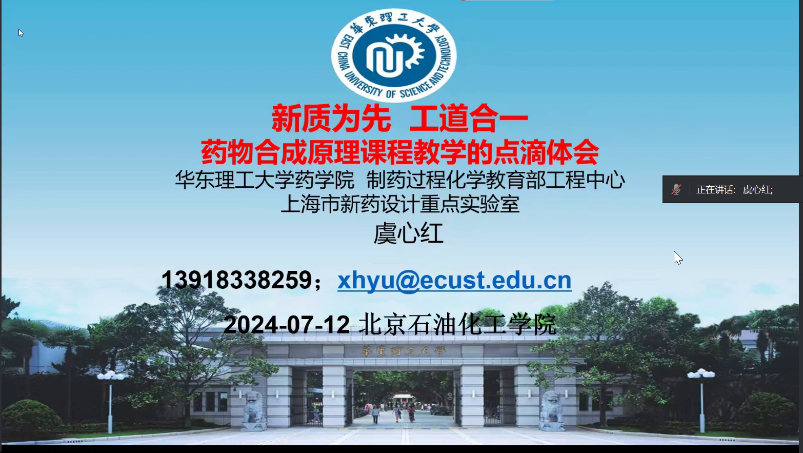 日前,我校制藥工程虛擬教研室順利組織舉辦了2024年度制藥工程名師示范課,會議由我校教務處處長、制藥工程虛擬教研室負責人王騰主持。華東理工大學藥學院虞心紅教授做題為《新質為先,工道合一——藥物合成原理課程教學的點滴體會》的示范教學。本次示范課吸引了全國各地眾多高校的同行老師參加,會議通過騰訊會議的方式進行。