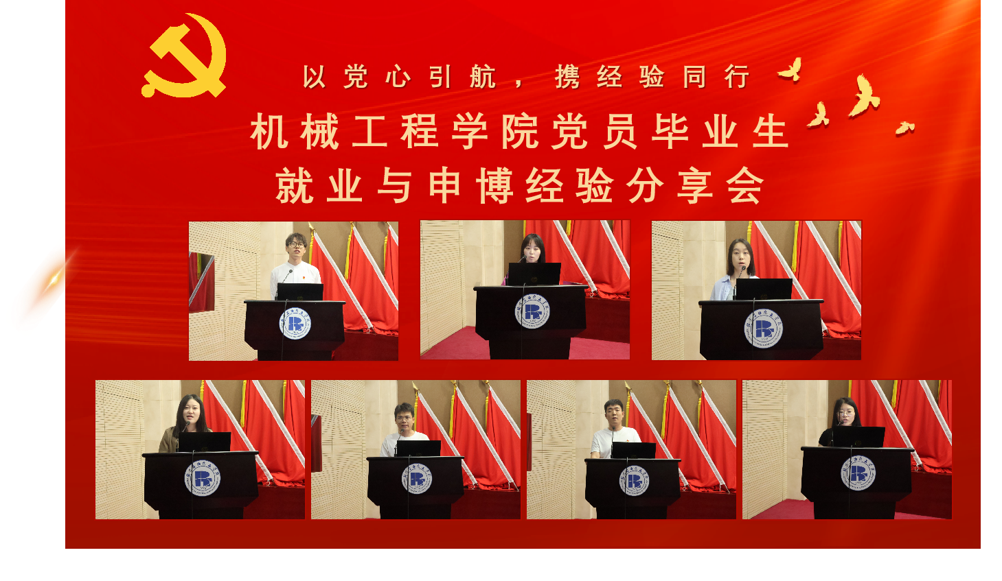 6 月 11 日,我校機械工程學院機械工程專業研究生第四黨支部在綜合實驗樓第二報告廳,舉辦 “以黨心引航,攜經驗同行” 黨員畢業生就業與申博經驗分享會。我校機械工程學院副院長張華,輔導員張萍出席,2023 級、2024 級百余名研究生參加,薛智龍主持活動,旨在落實立德樹人,發揮學生黨員作用,指導青年學生職業發展。