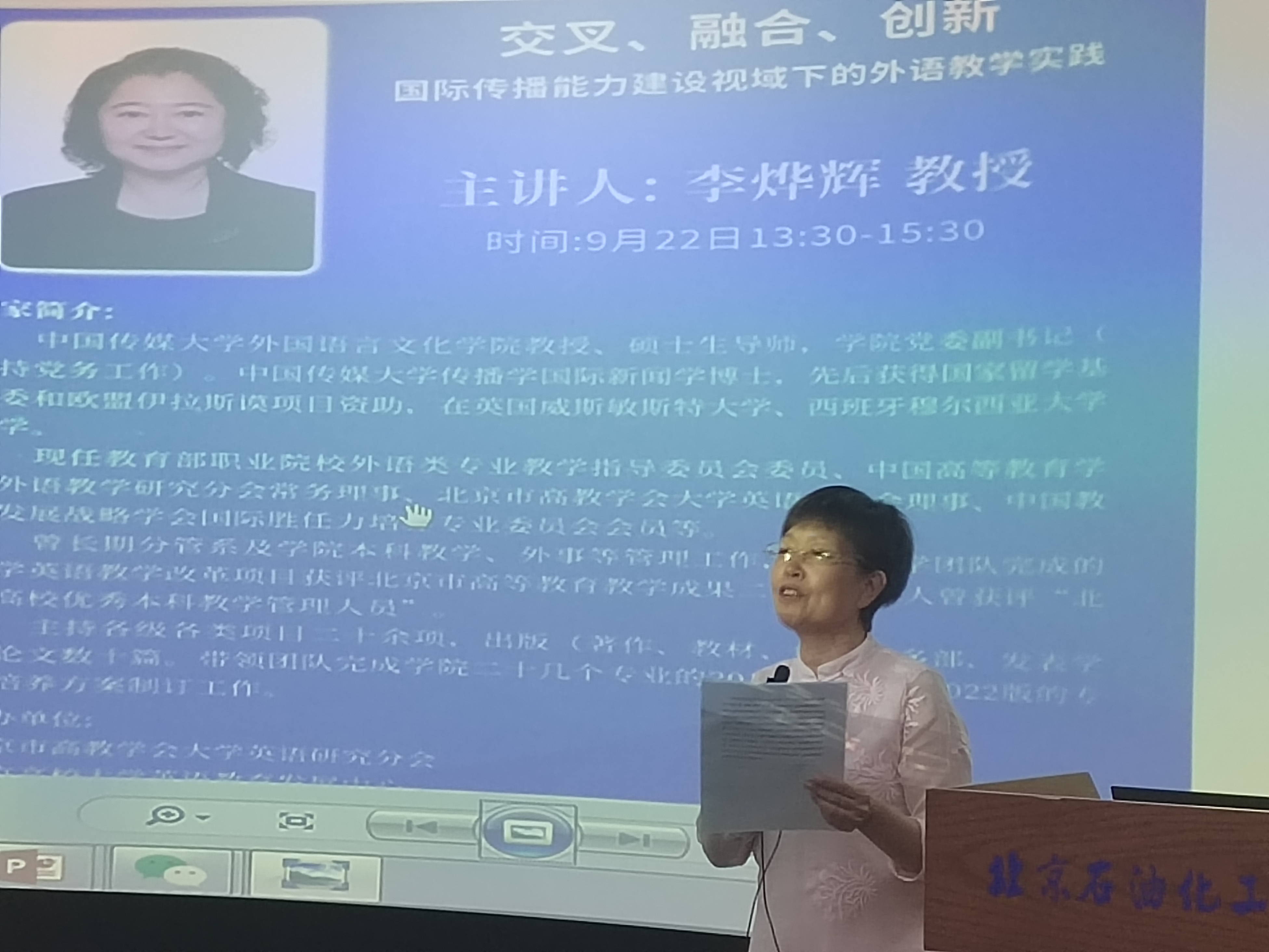 本期特邀嘉賓是教育部職業院校外語類專業指導委員會委員、中國高等教育學會外語教學研究分會常務理事、北京市高教學會大學英語研究會理事、中國傳媒大學外國語言文化學院黨委副書記(主持工作)李燁輝教授。北京市高教學會大學英語研究會理事、北京高校大學英語教育發展中心理事、北京石油化工學院致遠學院外語教研中心公共基礎課程群責任教授嚴姣蘭教授主持講座,北京石油化工學院致遠學院副院長王秀梅和外語教師參加了講座。講座通過騰訊會議同步直播,吸引了北京地區多所高校的眾多外語教師參與線上學習交流。