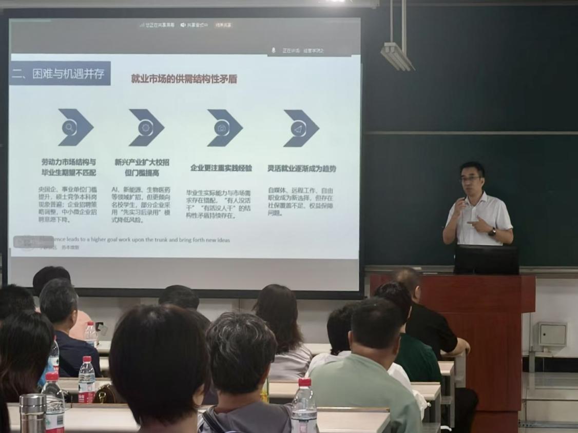 劉踐豐從學院就業工作現狀、工作舉措以及家校合作三個方面進行解讀。他介紹了學院2026屆畢業生就業的整體部署,回顧了2025屆畢業生的就業情況,并分析了2026屆畢業生就業工作的難點。他期望畢業生能夠積極行動起來,家長與班主任、輔導員之間能夠保持有效溝通,合力做好校內外銜接,明確就業預期,盡早引導學生做出合適的選擇。