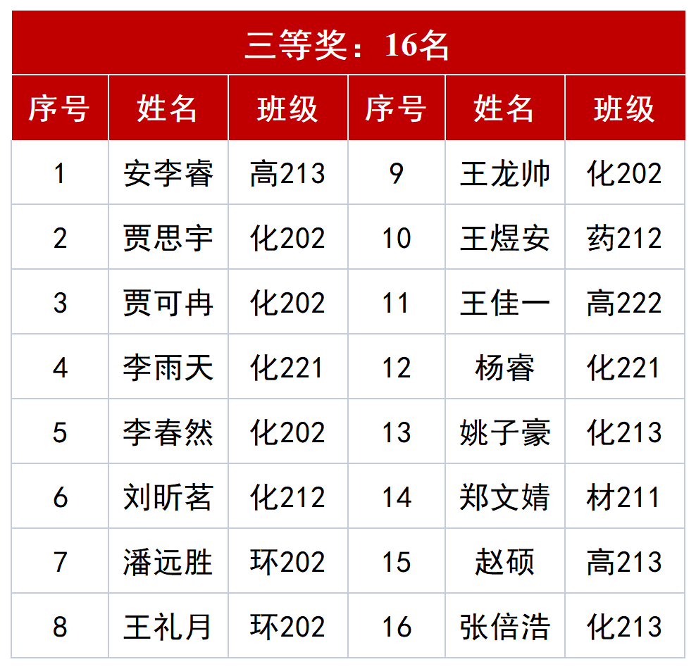 經過筆試和實驗操作的兩輪競賽,最后確定了北京石油化工學院第十一屆大學生化學實驗競賽獲獎名單,共產生一等獎10名,二等獎19名,三等獎16名。