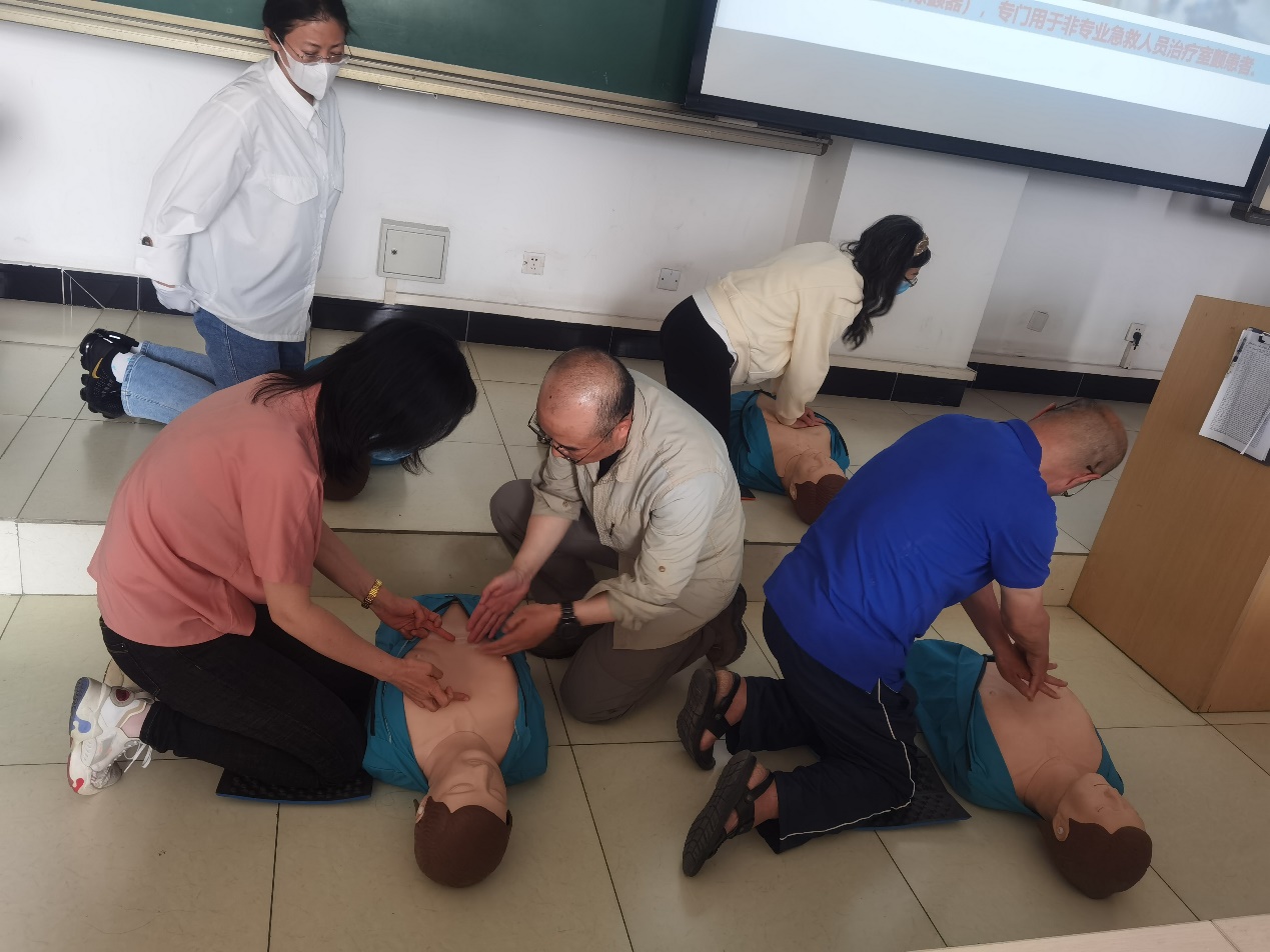 教師專場重點培訓了心肺復蘇術和AED的使用,教官詳細講解了當發現身邊有人倒地后的正確的救援方法與步驟,強調先要保證自身安全和環境安全的情況下再實施救援;之后通過教具演示了心肺復蘇的步驟和方法;然后介紹了AED自動體外除顫器使用方法。講解完畢,有多名教工在教官指導下進行了現場實操。