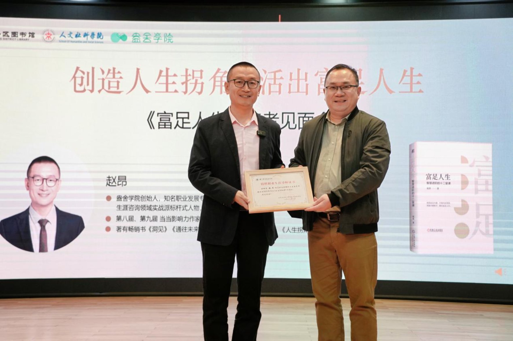 《富足人生》作者趙昂先生就生涯規劃著重分享了自己的觀點,為促進北京石油化工學院人文社科學院的生涯教育和就業工作能夠繼續高質量發展,我院聘請趙昂先生擔任職業生涯導師,并頒發了聘書。