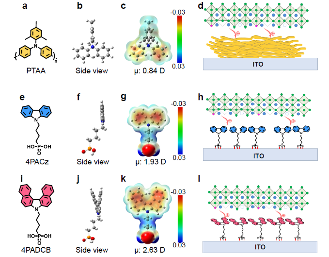 鈣鈦礦/鈣鈦礦(全鈣鈦礦)疊層太陽電池因制備成本低并有望突破單結(jié)太陽電池的肖克利-奎伊瑟理論效率極限而備受關(guān)注。作為其重要組成部分的寬帶隙鈣鈦礦子電池仍然存在亟待解決的基礎(chǔ)科學(xué)與關(guān)鍵技術(shù)問題,如界面缺陷引起的開路電壓(VOC)和填充因子(FF)損失,特別是在較大面積的電池上,這些問題尤為顯著,嚴(yán)重制約大面積寬帶隙鈣鈦礦和疊層電池的發(fā)展。開發(fā)合適的方法和電荷傳輸材料改善寬帶隙鈣鈦礦子電池的界面質(zhì)量對于提升疊層器件的效率及穩(wěn)定性意義重大。