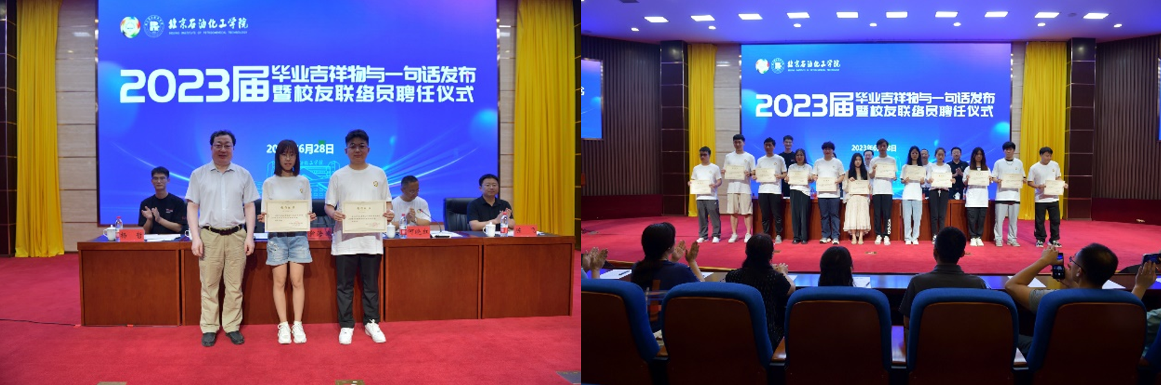 大會首先進行了2023屆畢業吉祥物與一句話發布儀式,宣布了畢業吉祥物與一句話獲獎名單,并向獲獎的17位同學與院系頒發了證書。校友聯絡員聘任儀式上,校友工作辦公室主任何曉紅宣讀了《關于聘任2023屆畢業生校友聯絡員的決定》,校領導和嘉賓為70名校友聯絡員頒發了聘書。