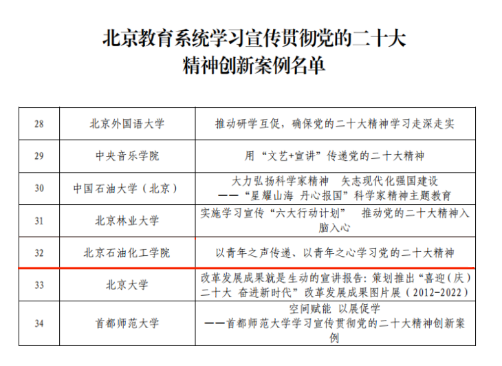 近日,北京市委教育工委公布了北京教育系統學習貫徹黨的二十大精神創新案例評選結果,我校基于“學習宣傳黨的二十大精神學生宣講團”報送的案例“以青年之聲傳遞,以青年之心學習黨的二十大精神”成功入選。