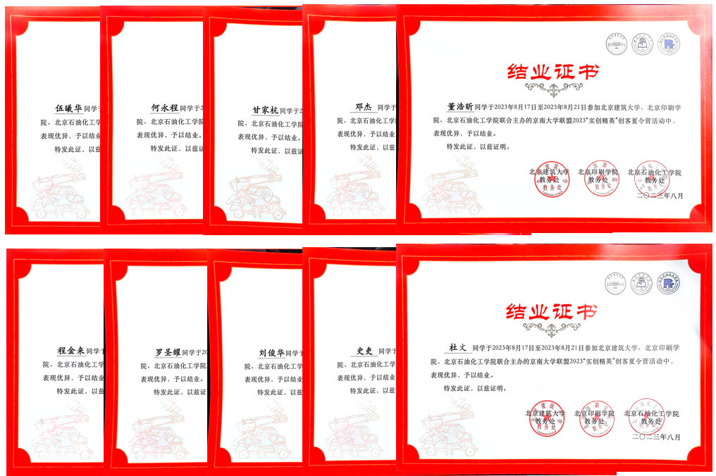 在工程師學院丁杰老師的帶領下,我校10名同學在活動中認真學習、積極交流,受到了一致表揚和認可。經過一周的豐富多彩的學習實踐活動,大家收獲頗豐,既提高了眼界,又提升了工程創新能力,并順利獲得了由三所學校聯合頒發的結業證書。